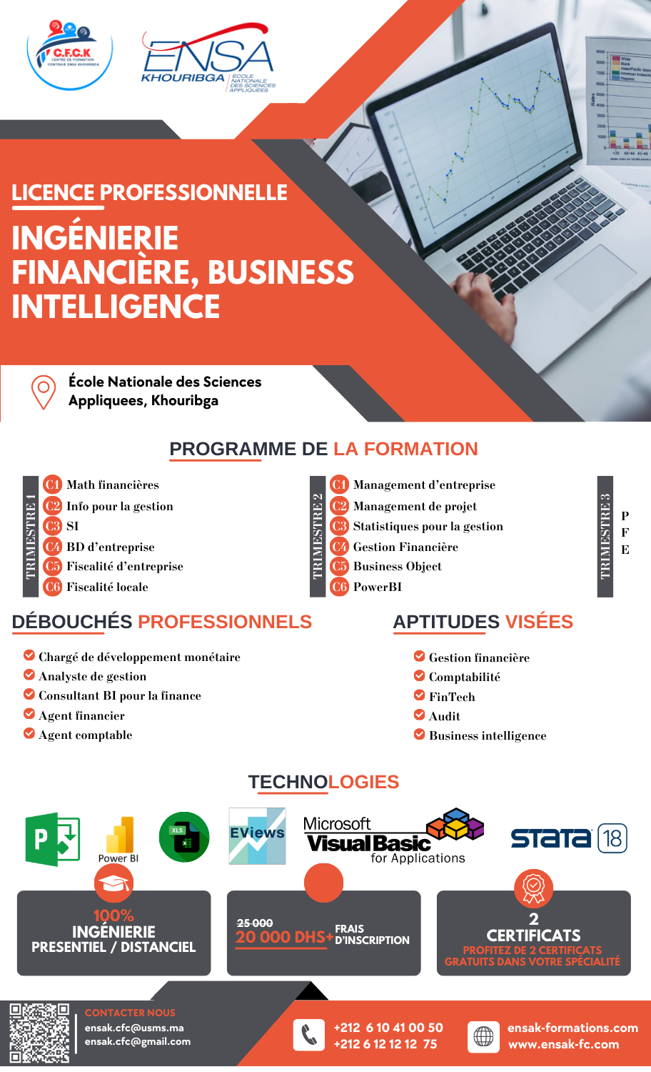 La Licence d’Université Spécialisée : Ingénierie Financière, Business Intelligence, accréditée par l’Université Sultan Moulay Slimane – ENSA Khouribga, forme des spécialistes hautement qualifiés capables d’exercer les métiers de la finance en association avec les outils de la Business Intelligence.